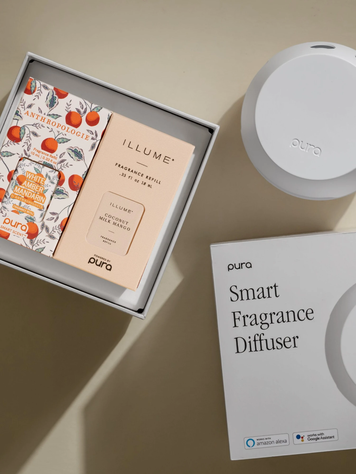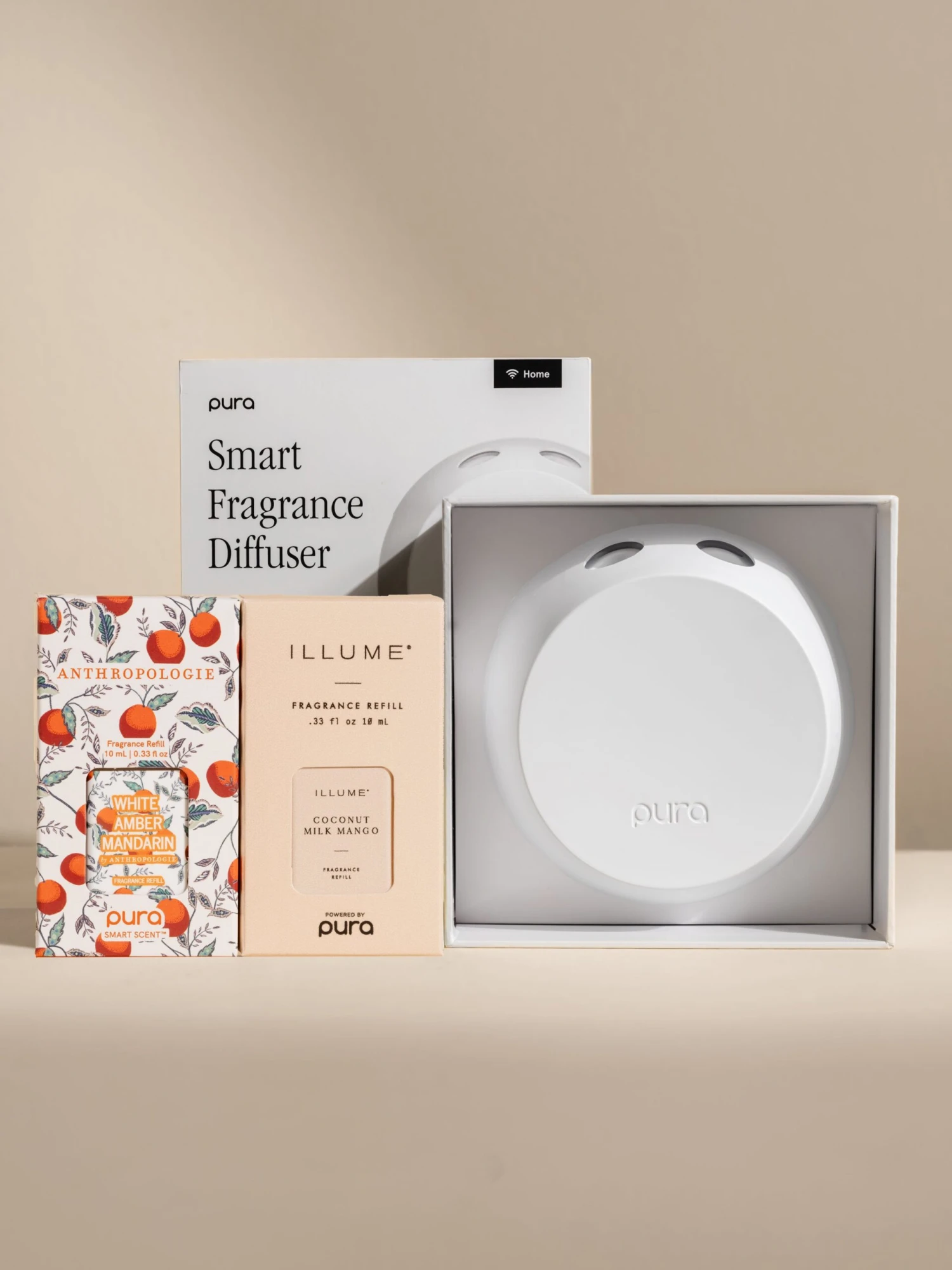 This set includes two premium scents, Anthropologie’s White Amber Mandarin and ILLUME’s Coconut Milk Mango, and a Pura 4â„¢ smart fragrance diffuser.