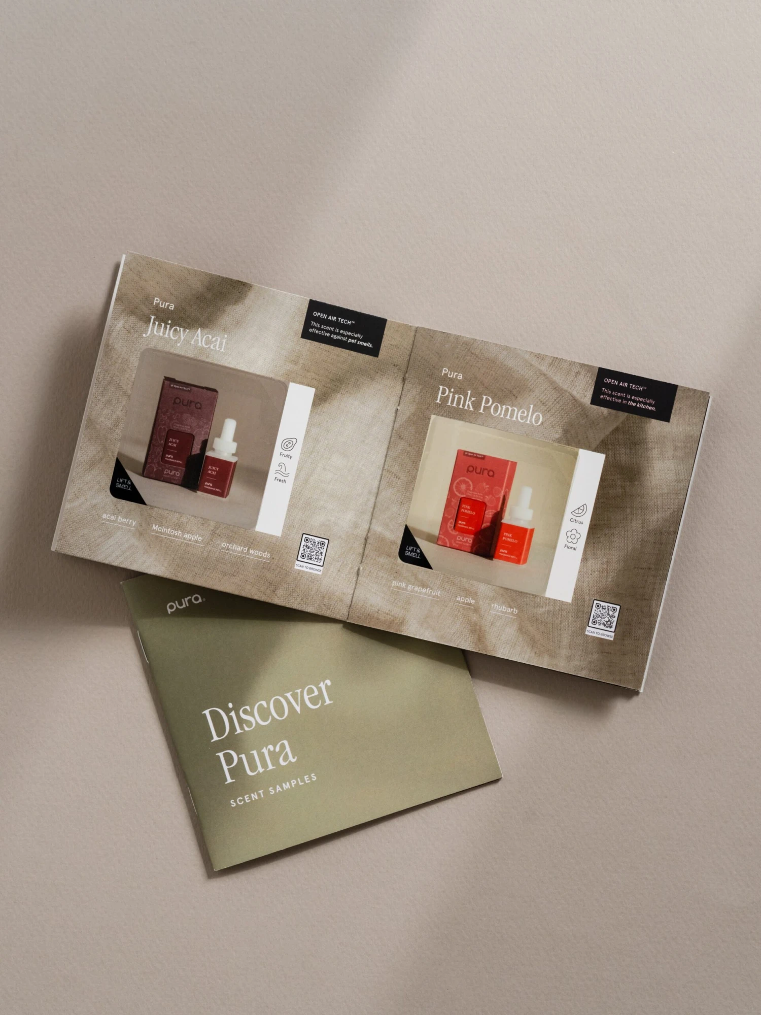 Our scent sample booklets were created to help you find scents that you love in a quick and easy way. This booklet includes seven premium top-selling Pura and Simplicity by Pura scent samples—simply lift the scent film to experience the fragrance.