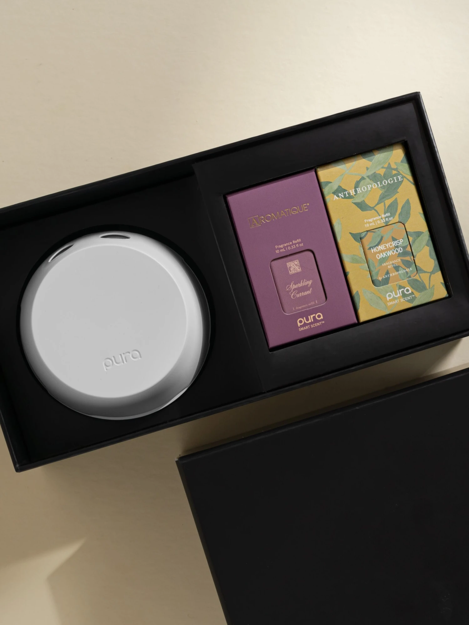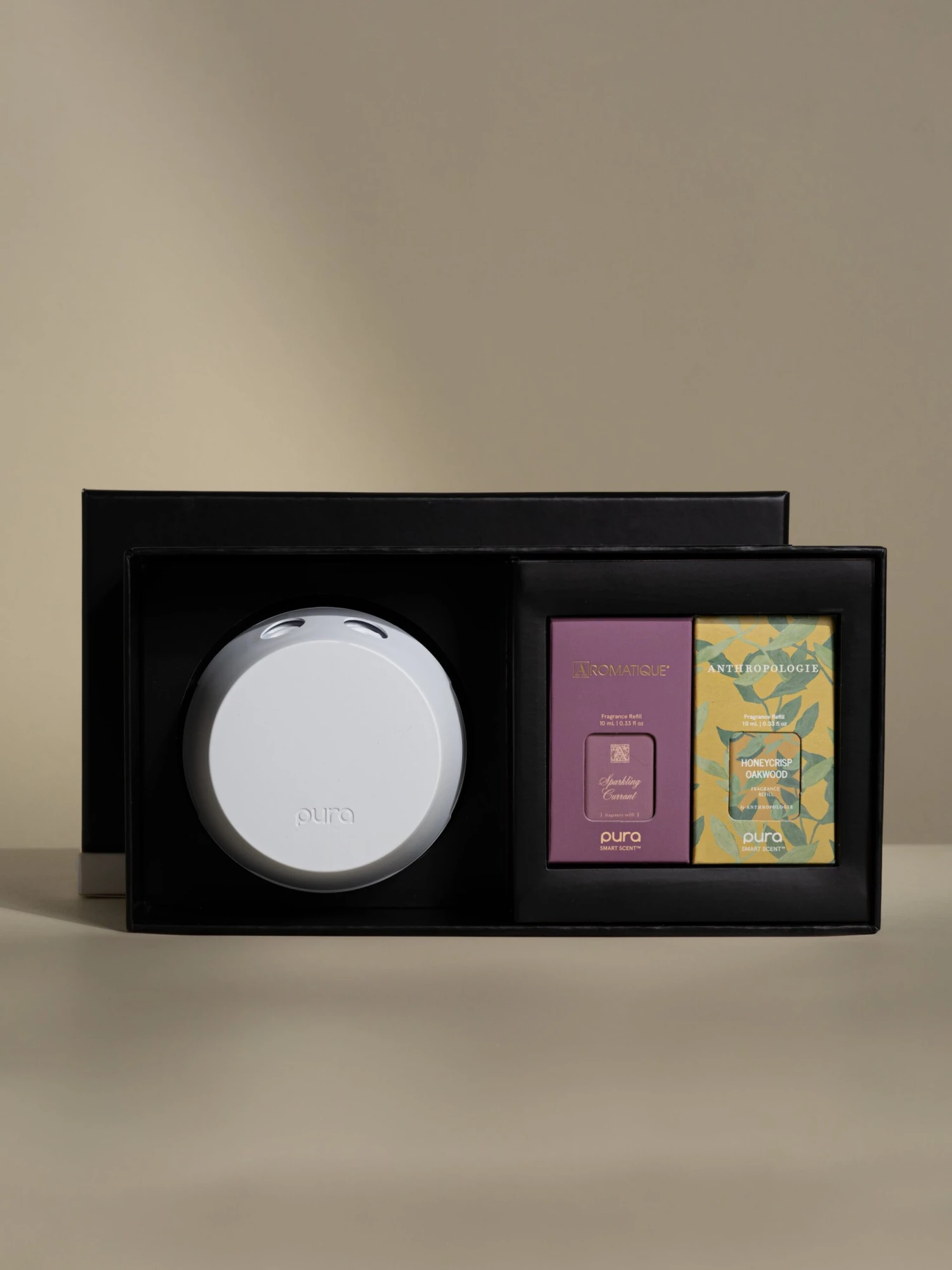 This set includes two premium scents, Anthropologie’s Honeycrisp Oakwood and Aromatique’s Sparkling Currant, and a Pura 4TM smart fragrance diffuser.